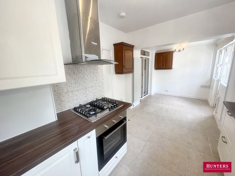 double glazed window to garden, uPVC doors to side and rear, range of wall and base units with work surfaces incorporating 1.5 bowl stainless steel sink with mixer tap, gas hob with extractor hood above, electric oven below, freezer, washing machine, free-standing fridge,