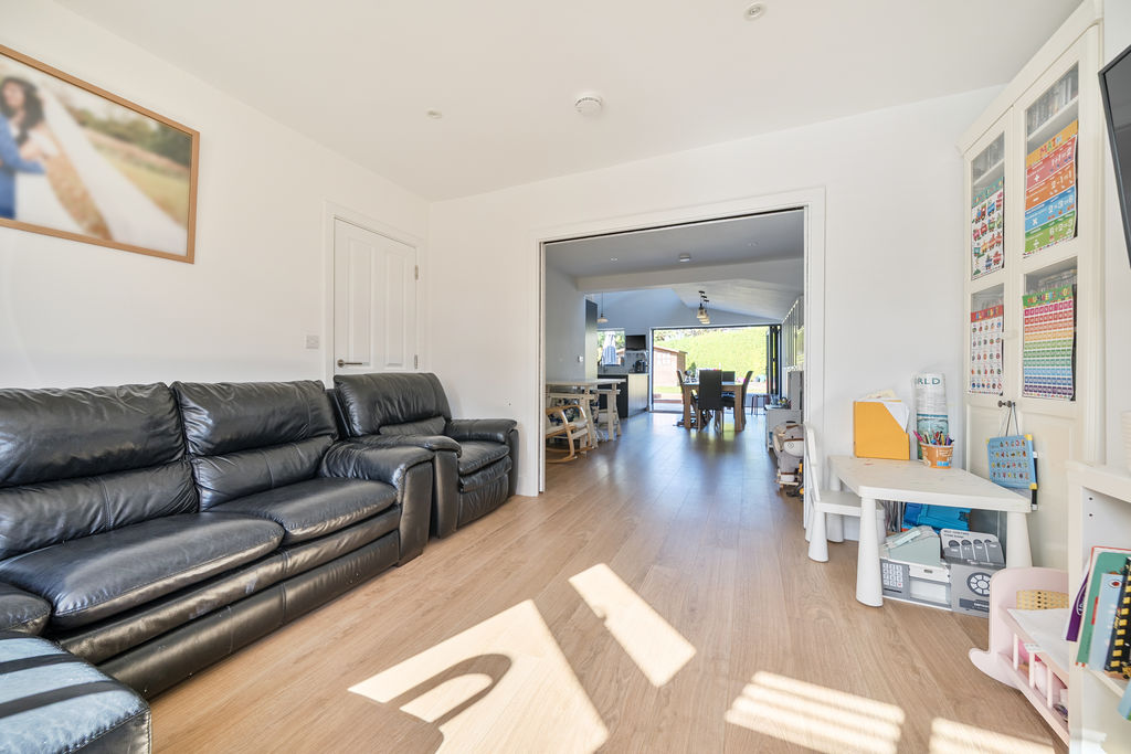 The ground floor features a bay-fronted lounge with pocket sliding doors, allowing for a flexible open-plan or separate living area as needed. A dedicated dining space flows seamlessly into the modern kitchen/breakfast room, complete with underfloor heating bi-fold doors opening onto the garden—perfect for indoor-outdoor entertaining.