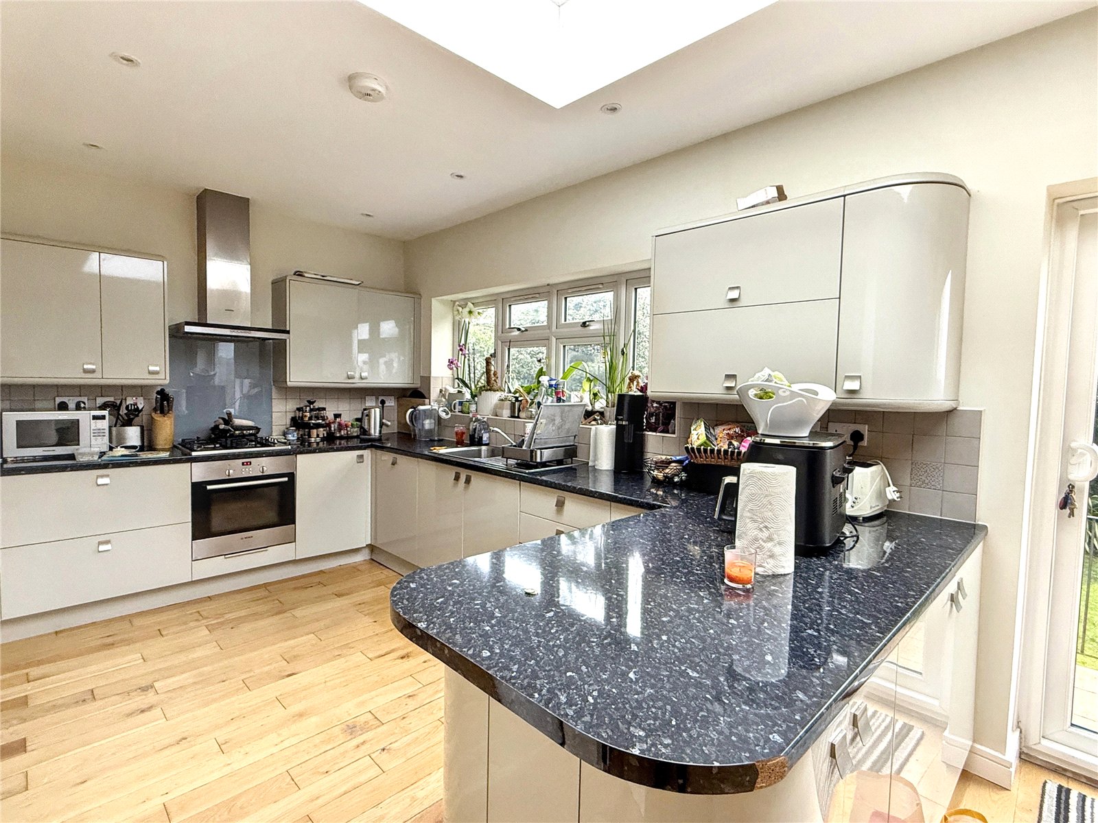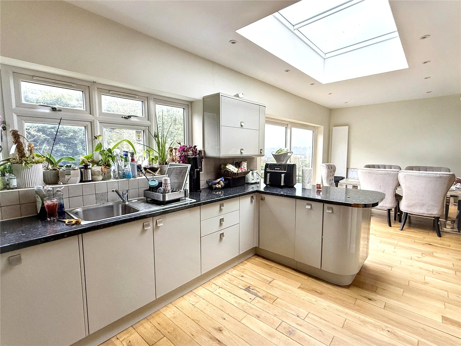 The accommodation is thoughtfully arranged, with a rear aspect open plan living space forming the heart of the home. This includes a contemporary fitted kitchen with granite work surfaces and breakfast bar, seamlessly flowing into the dining area and lounge with direct access to the garden, ideal for both everyday living and entertaining.
