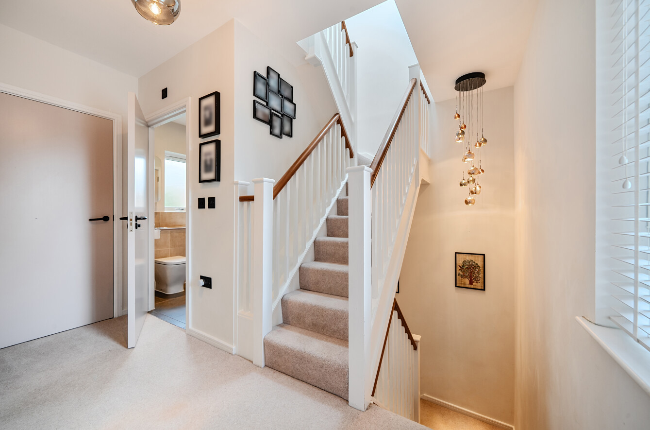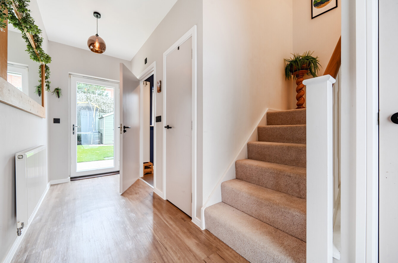 The property opens into a generous entrance hall with a guest WC and ample storage space. To the rear, a bright and comfortable lounge provides direct access to the garden, while the front of the home features a fully fitted kitchen breakfast room.