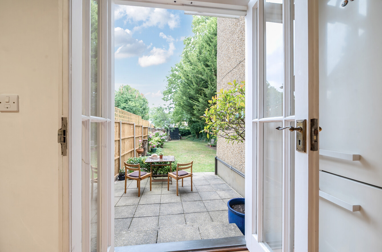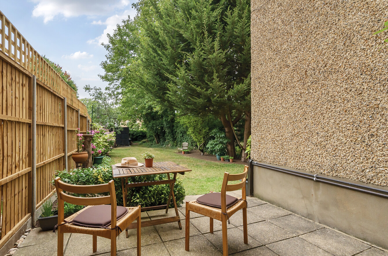 The private patio opens out to a beautifully maintained communal lawned garden, ideal for relaxing or entertaining.