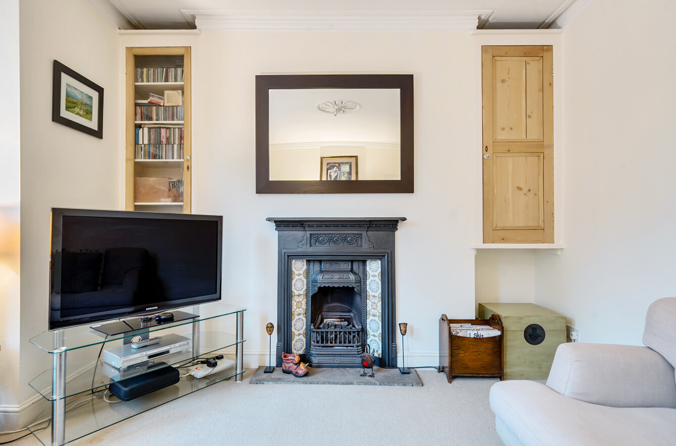 Spacious bay-fronted reception room with high ceilings & feature fireplace