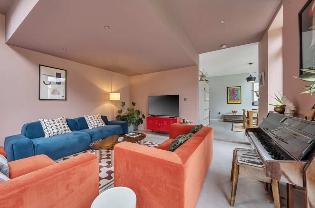 The rear extension is the standout feature, with polished concrete floors, dramatic angular ceilings and full-width glazing bringing light and space to the heart of the home. The open-plan lounge and kitchen/breakfast room open through bi-fold doors onto a decked terrace and lawned 48x45ft garden. The kitchen features a range cooker, copper splashback and ample storage, with interiors throughout finished in paint from Coat and House of Hackney.