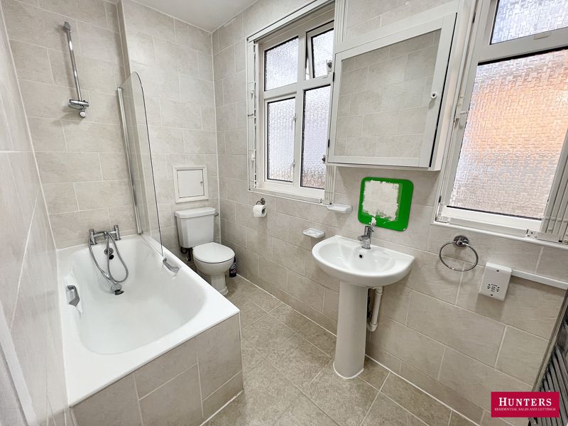 double glazed window to side, panelled bath with shower attachment and shower screen, low flush w.c., pedestal wash hand basin, fully tiled walls, heated towel rail.