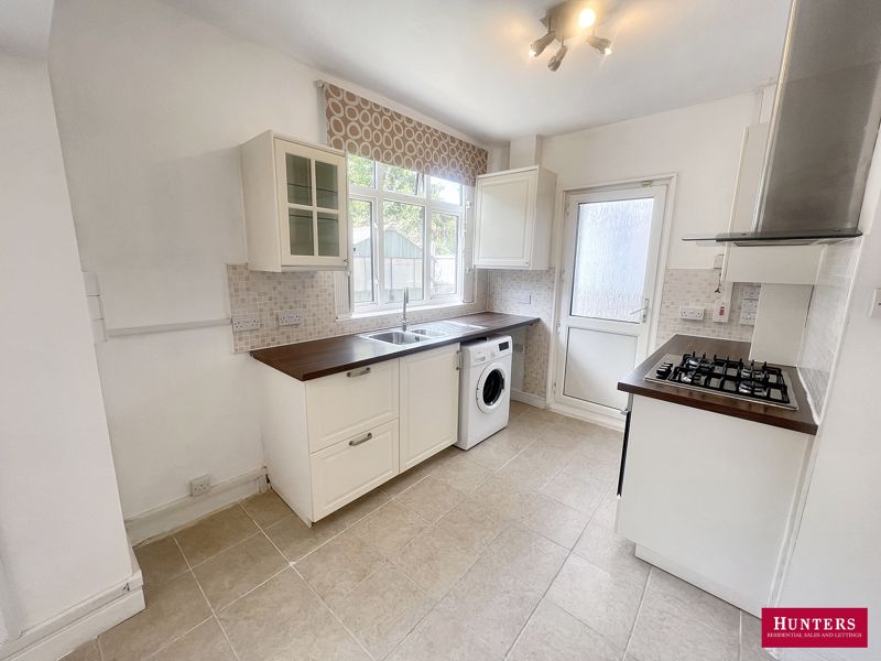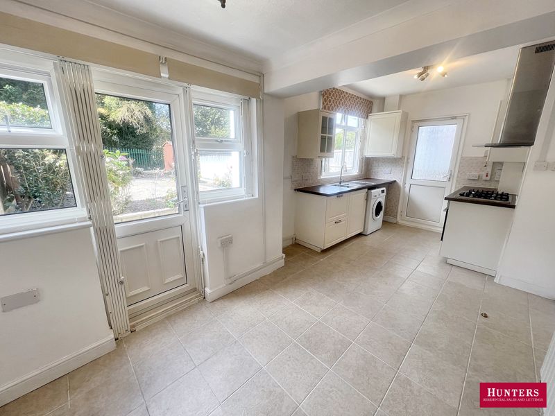 double glazed window to garden, uPVC doors to side and rear, range of wall and base units with work surfaces incorporating 1.5 bowl stainless steel sink with mixer tap, gas hob with extractor hood above, electric oven below, freezer, washing machine, free-standing fridge,