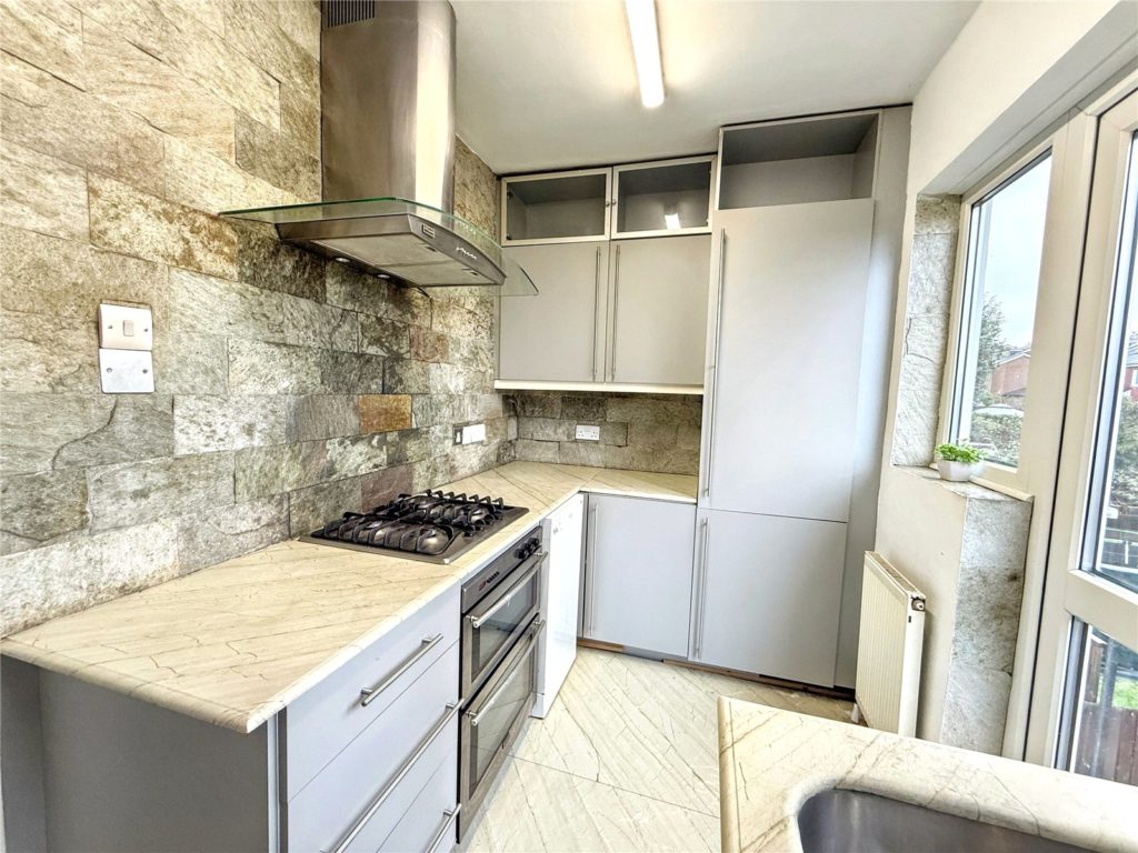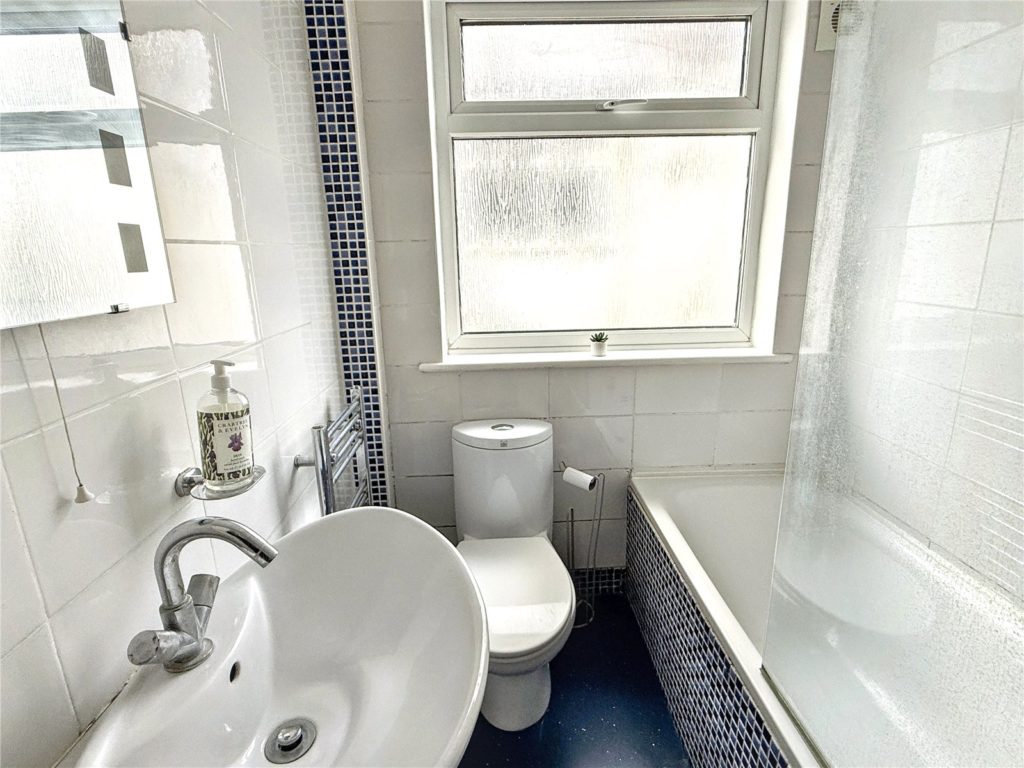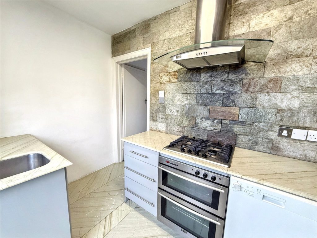 The accommodation is accessed via the property’s own private entrance at ground floor level, with stairs leading to the first floor. The layout comprises a front-aspect bay-fronted reception room, a fitted kitchen with integrated fridge freezer, dishwasher, and washing machine, with stairs leading down to the private garden. There are two bedrooms and a three-piece family bathroom.