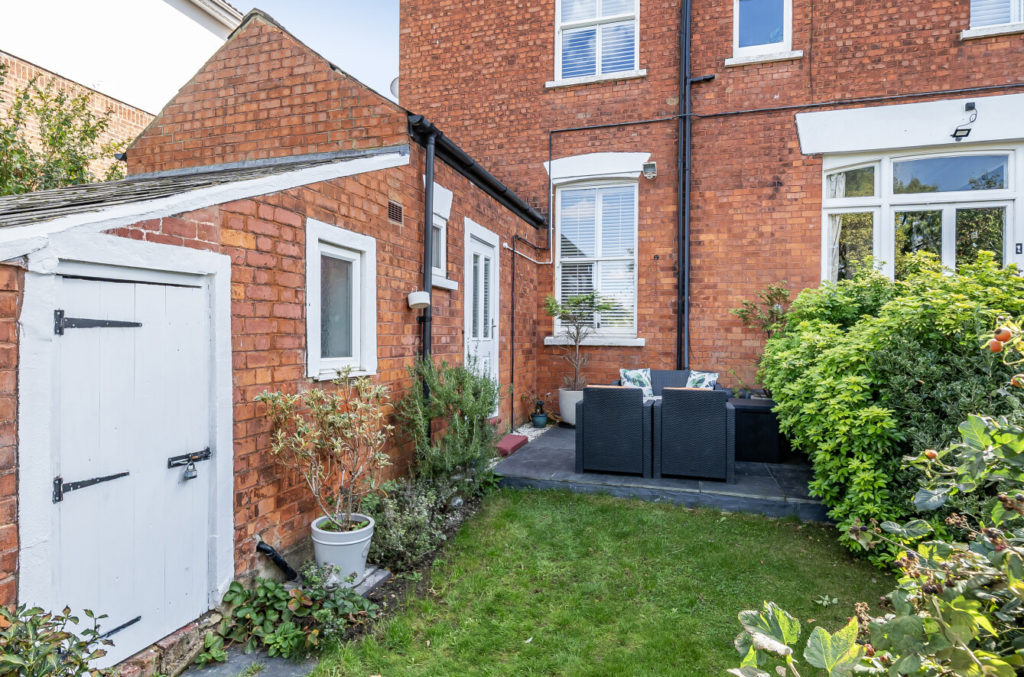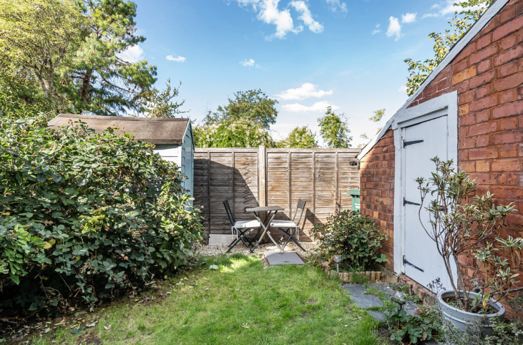 The accommodation comprises a bright reception room with a feature fireplace, a separate fully fitted kitchen, a front-facing double bedroom with built-in wardrobes, and a modern three-piece shower room. The private rear garden, accessed via the kitchen, offers a peaceful retreat with a patio seating area, lawn, and established planting. A brick-built storage shed adds valuable outdoor storage space.